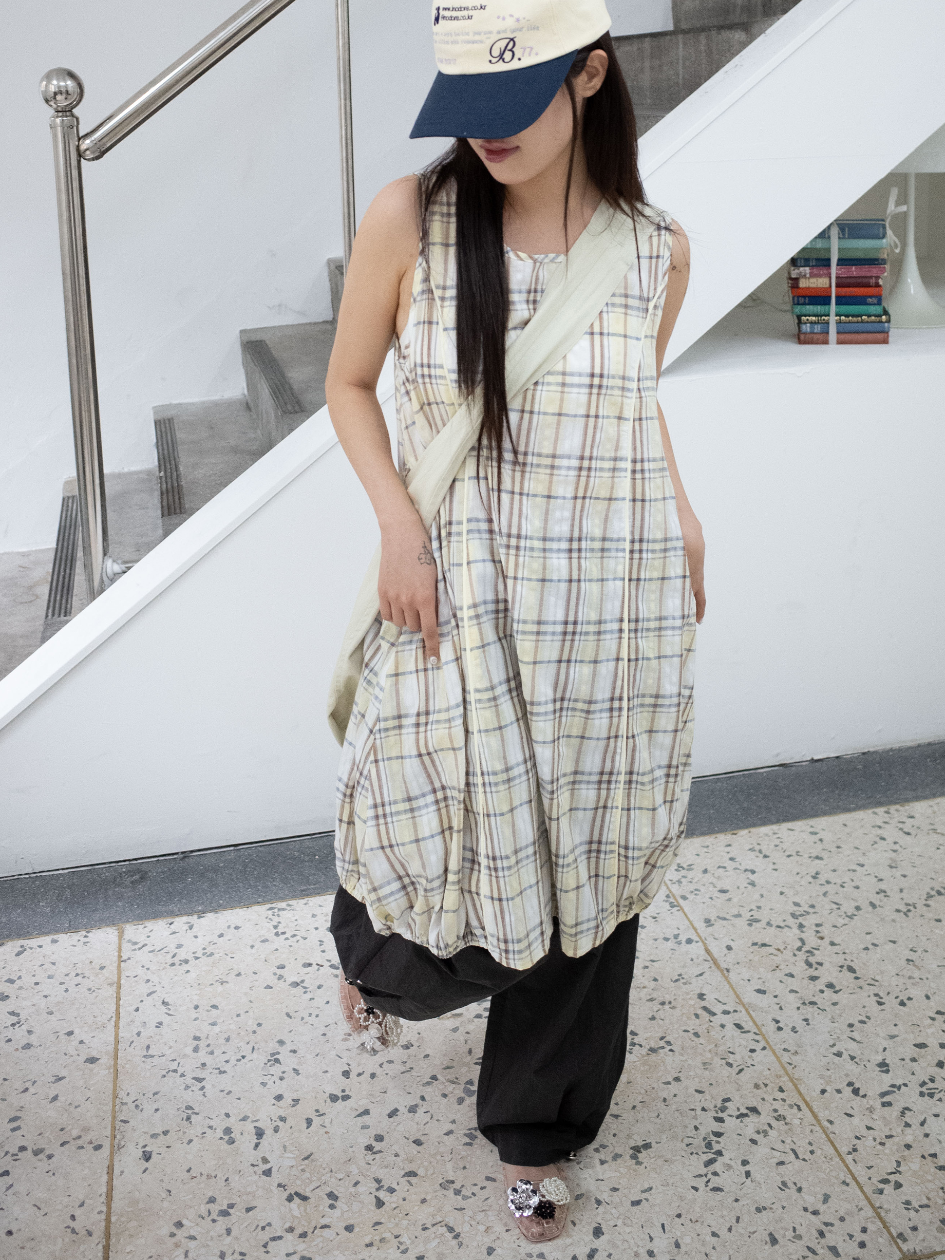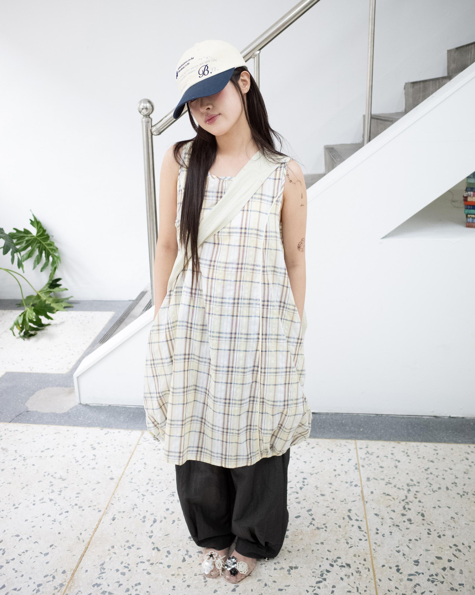 얇고 가벼운 체크 원단으로 제작되어 레깅스나 팬츠, 스커트 등 다양한 하의와 매치하기 좋고, 슬리브리스 형태로 계절에 따라 다양하게 레이어링하여 활용할 수 있습니다. 프린세스 절개선을 따라 파이핑 봉제로 마감해 입체감 있는 구조를 살리고, 날개뼈 사이에 온스카 로고 자수를 더했습니다. 허리 양 옆의 끈으로 실루엣을 조절할 수 있으며, 여유 있는 핏으로 편하게 착용할 수 있습니다.